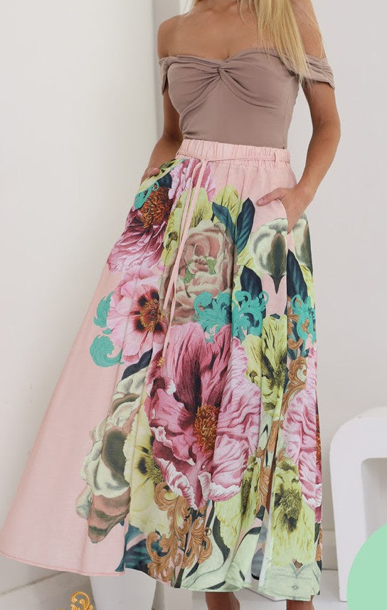 Maxi skirt, elastic casing waistband , thin tie up belt with gold sun motif bead ends , Lined