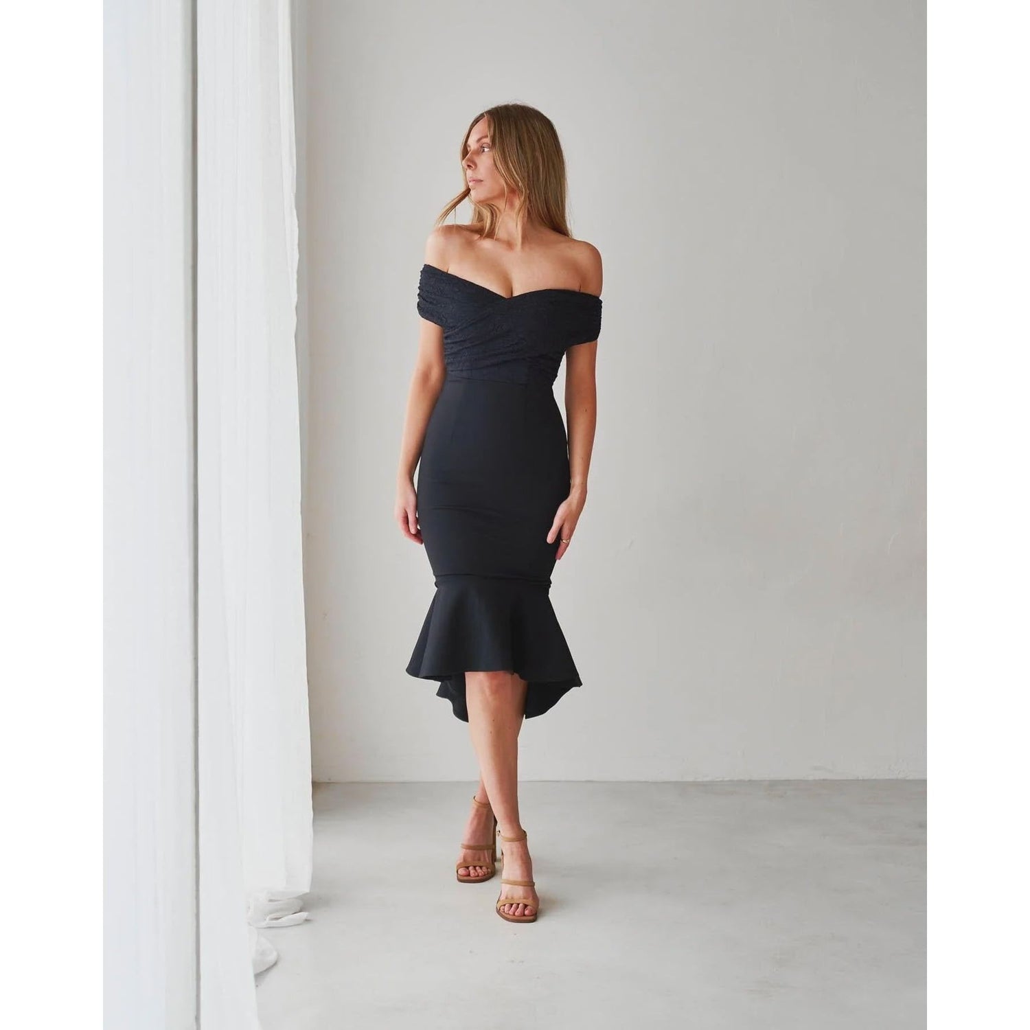 TheBrenna Dress Dress by Twosisters The Label is a refreshing twist on our beloved bestselling styles. Featuring flattering lace off-the-shoulder neckline with wrap detail adds a touch of elegance. The cinched waist accentuates your figure, while the fishtail-style hem adds a dramatic flair. This dress embodies grace and sophistication, ensuring a memorable entrance at any formal event.