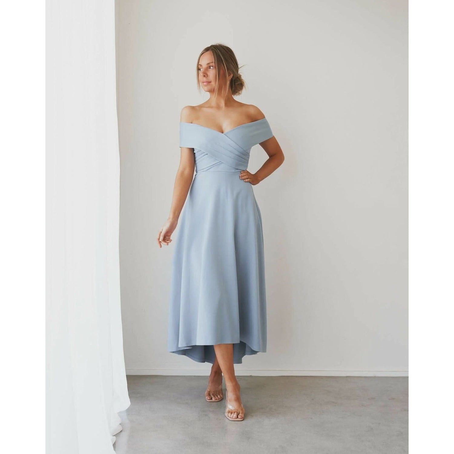 Indulge in the enchanting allure of the legendary Belina Dress by Twosisters the label. With its off-shoulder style and graceful maxi high low A-line skirt, this dress is a testament to timeless elegance and captivating charm.